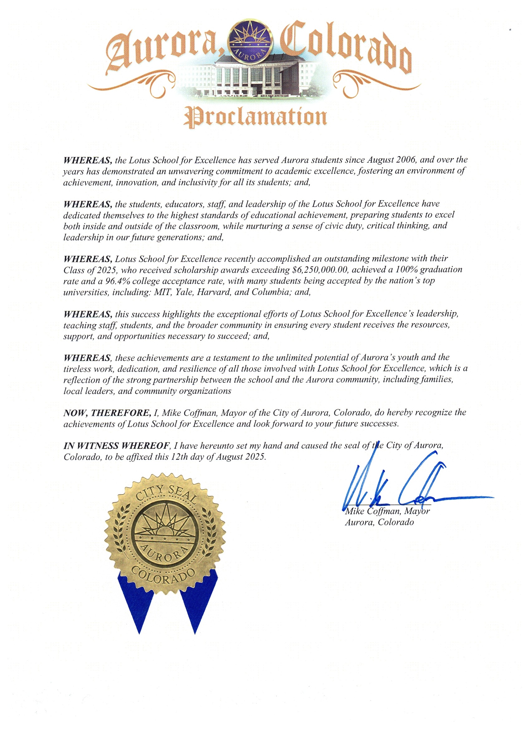 We are proud to share that the City of Aurora has officially issued a Proclamation honoring the outstanding achievements of Lotus School for Excellence. This recognition highlights our unwavering commitment to academic excellence, student success, innovation, and inclusivity.