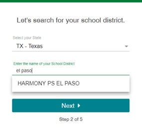 3) Select “Texas” from the drop down box. Then type in the city of your district office location, and select the district from the drop down box. If you are unsure of the name of your district, click HERE to see a list of schools and the associated district. After you have selected the district from the drop down box, click “Next”: