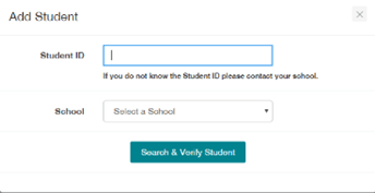 8) Enter your child’s student ID and select the school attended. If you don’t know your child’s ID number, you may log into Skyward and find it under Student Profile. If you need assistance, call the school. After entering the ID number and school, click on “Search and Verify Student.” Once their name appears, click on “Add this student”: